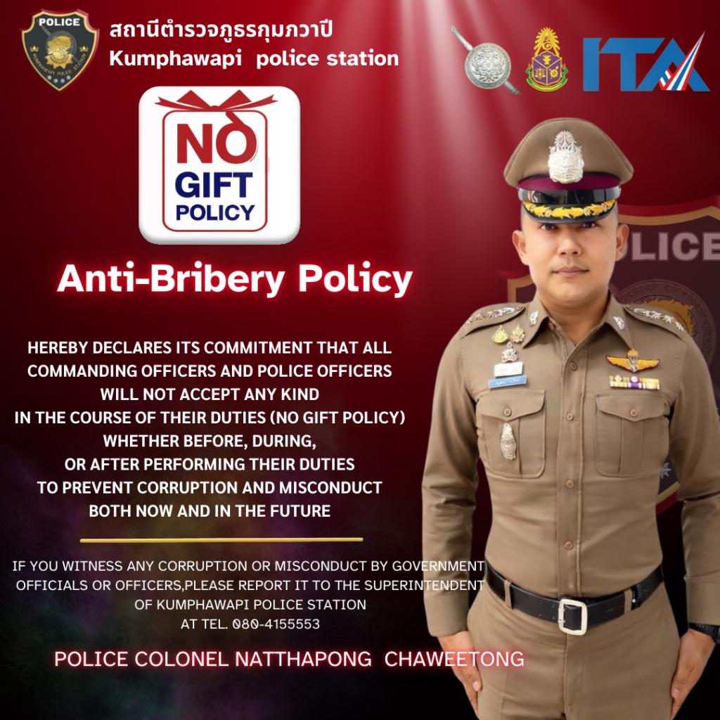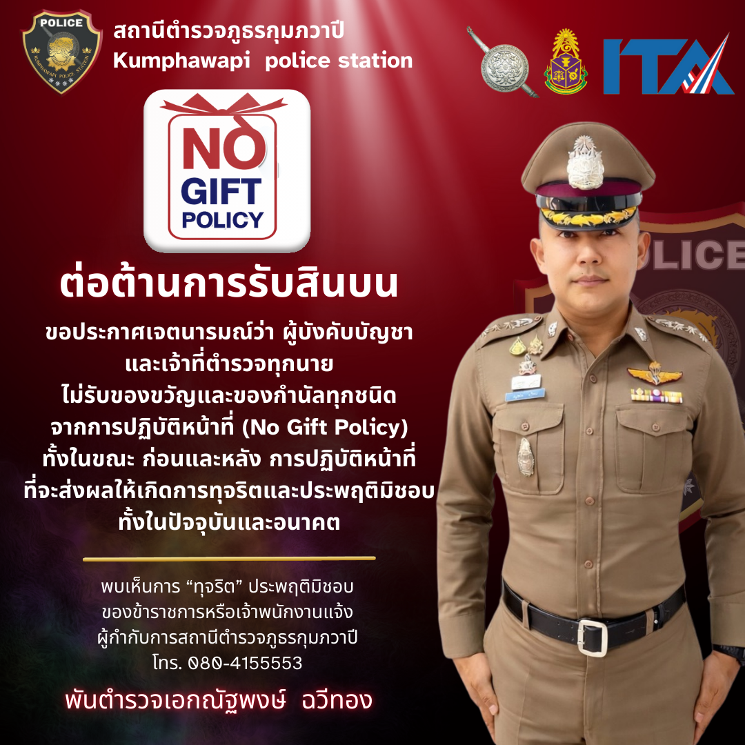 ประกาศเจตนารมณ์ของหน่วยงานที่จะไม่รับของขวัญและของกำนัลทุกชนิดจากการปฏิบัติหน้าที่ (No Gift Policy)