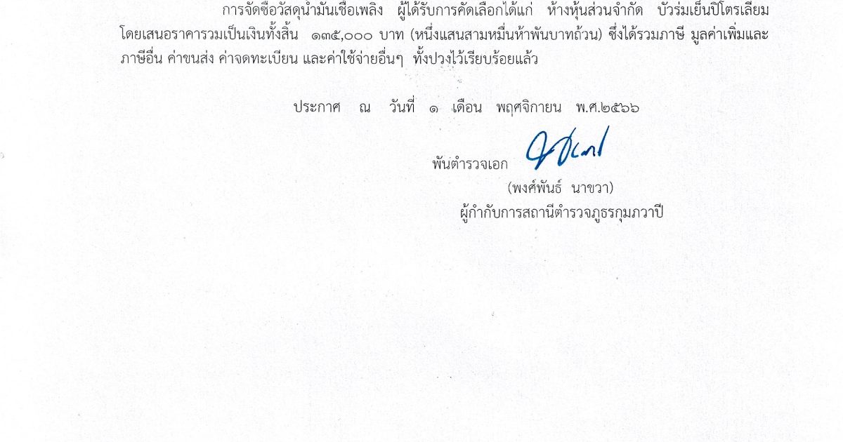 ประกาศผู้ชนะการเสนอราคาน้ำมันเชื้อเพลิง โดยวิธีเฉพาะเจาะจง เดือน พฤศจิกายน 2566